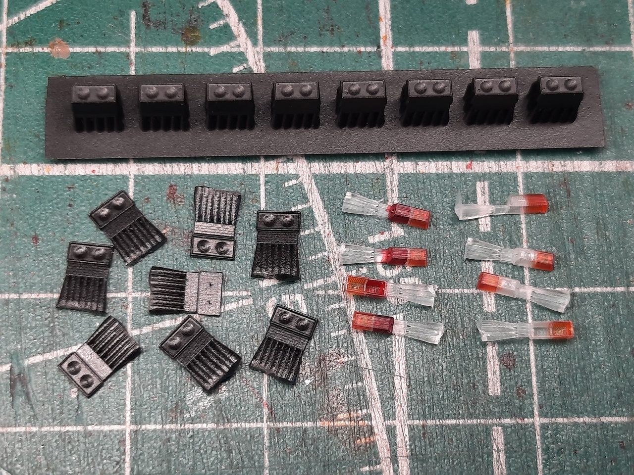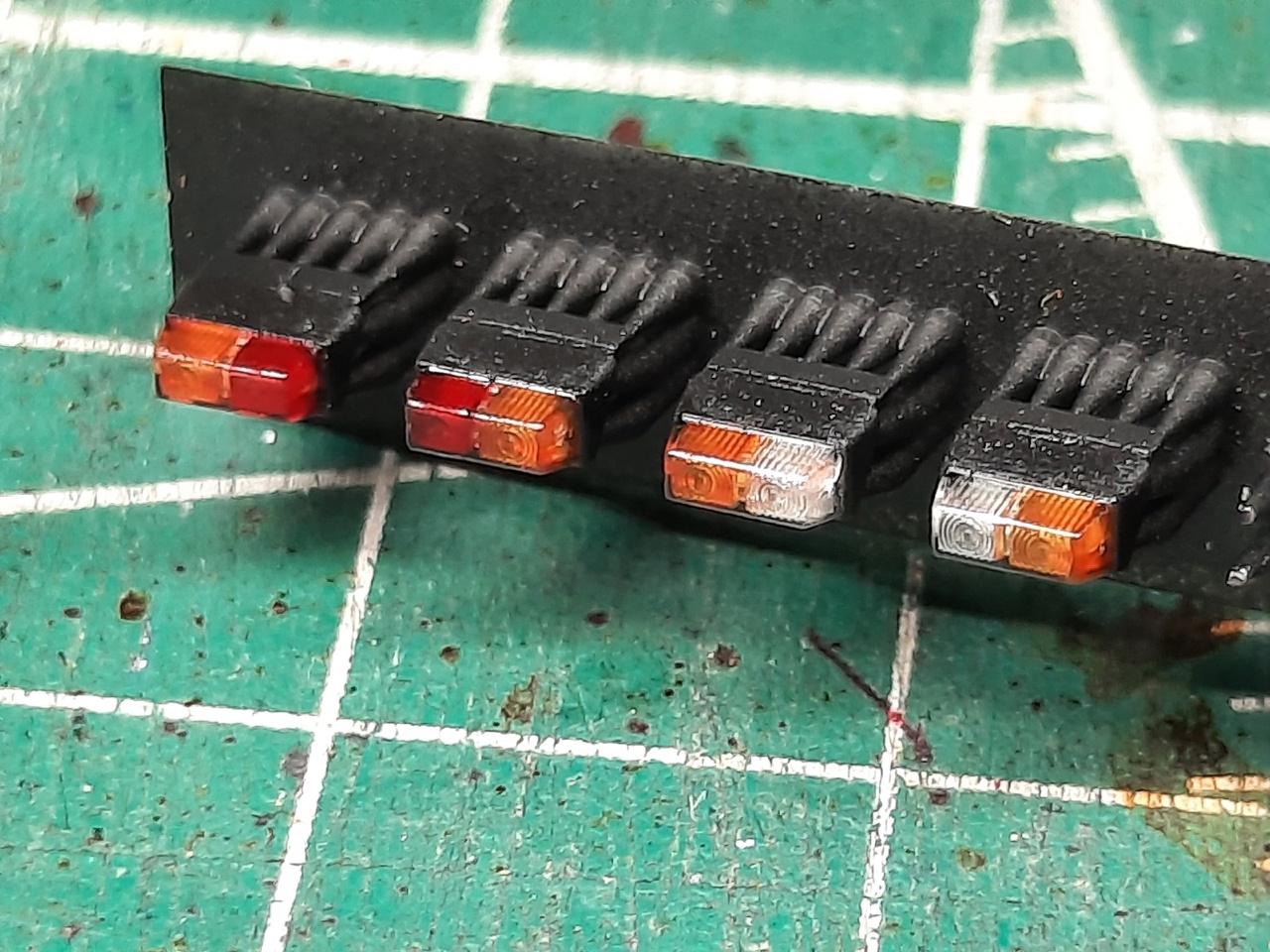 В комплект входят 4 стеклышка задних фонарей, 4 стеклышка передних фонарей, 8 корпусов черного цвета и 8 имитаций корпусов черного цвета, для установки в труднодоступные места на моделях, где не предусмотрен уклон, для установки данных фонарей.